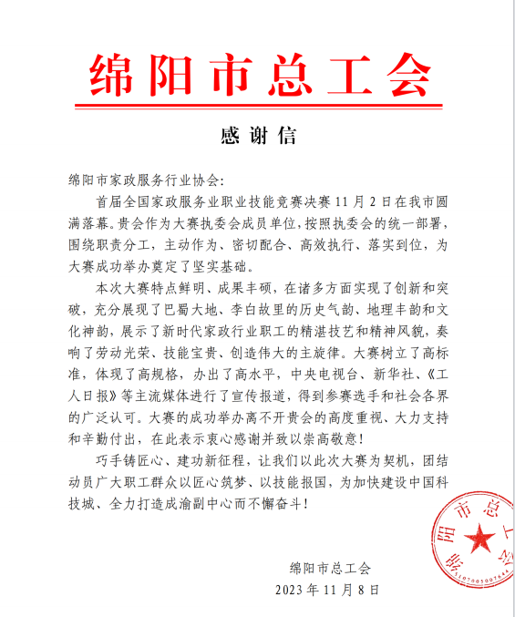 綿陽市家政服務(wù)行業(yè)協(xié)會(huì)力助首屆全國(guó)家政服務(wù)業(yè)技能競(jìng)賽決賽在綿陽圓滿落幕,綿陽市總工會(huì)高度贊揚(yáng),綿陽市美新家政熱烈祝賀!